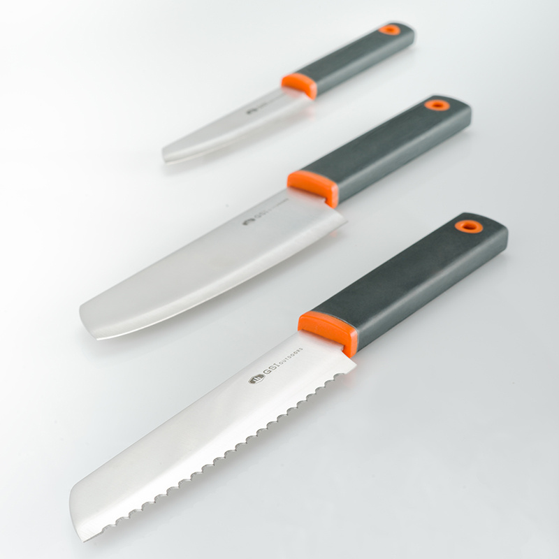 Kompaktní cestovní sada kvalitních nožů z nerezové oceli. Sada Santoku Knife set obsahuje tři nože: větší kuchyňský s čepelí 15cm, menší nůž s čepelí 10cm a zubatý nůž na pečivo. Všechny nože mají pogumovanou rukojeť pro maximálně bezpečné a pohodlné uchopení. Nože mají také na rukojeti otvor pro šňůrku na zavěšení, ale samozřejmě je lze připnout i na magnetický kuchyňský pásek. Všechna ostří mají ochrannou krytku.