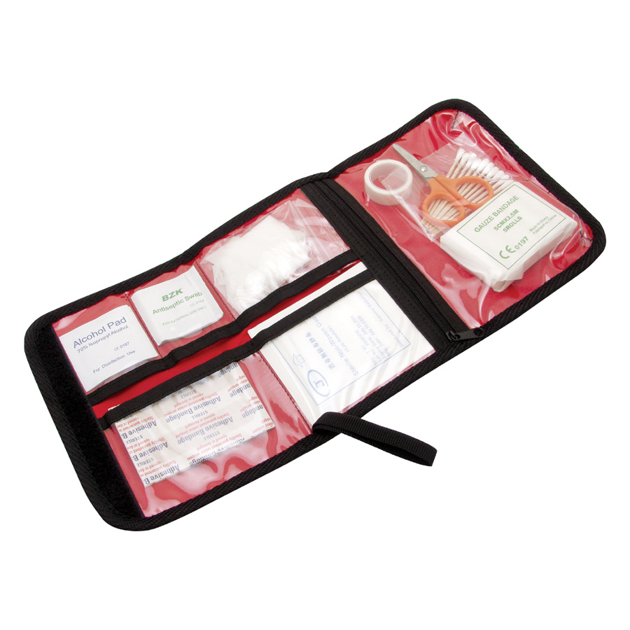 látkový obal, nůžky,latexové rukavice, leukoplast, 4 alkoholové polštářky, 10 oboustr.štětiček, 6x sterilních tampnů 5x5cm, 5x g
