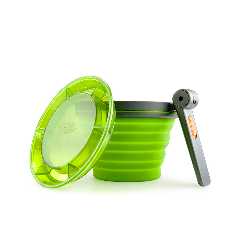 Praktický hrnek s vychytanou integrovanou skládací rukojetí se zámkem pro fixaci ve dvou různých polohách. Horizontální pro lepší manipulaci při jídle, a diagonálně-vertikální pro manipulaci při pití. Složený silikonový hrnek má výšku pouhých 43mm, Hrnek lze rozložit až do objemu 680ml. Víčko z Infinity clear Polypropylenu perfektně zapadá do horního lemu hrnku a dokonale izoluje obsah před okolními vlivy a chrání před vylitím.