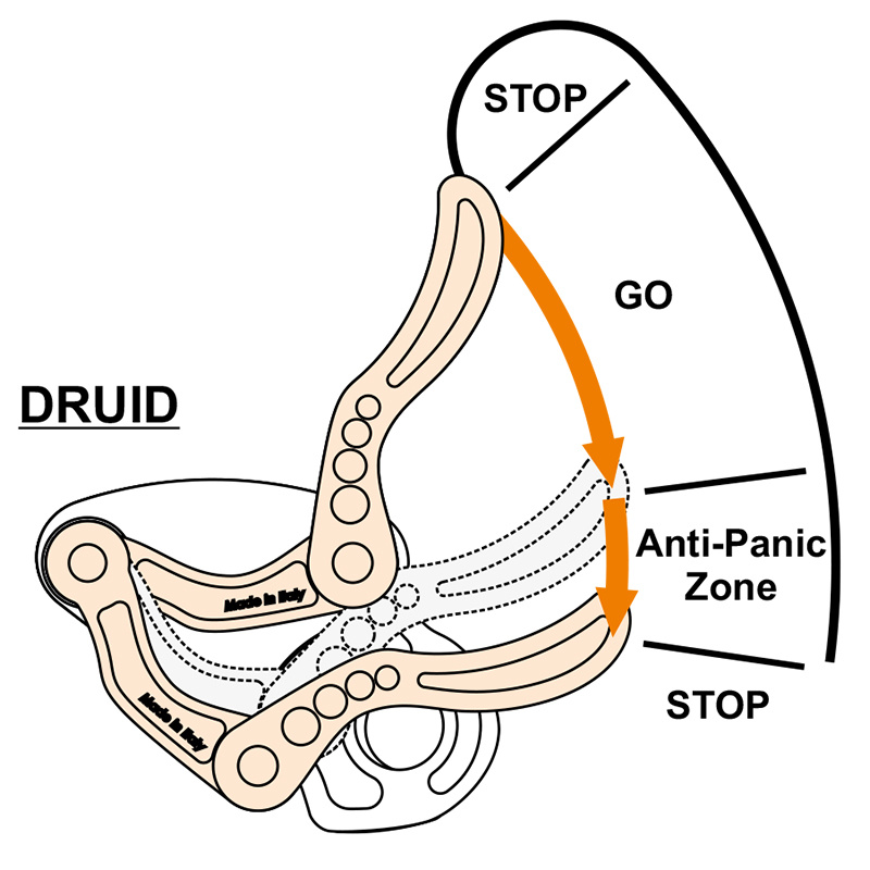 CAMP Safety DRUID je lehká a kompaktní slaňovací brzda s automatickým blokováním pro práce ve výškách a záchranné složky. Brzda je určena pro statická lana o průměru 9,9 – 11 mm. Vysokou míru bezpečnosti zajišťuje funkce „anti-panic“, která v případě příliš velkého tlaku na spouštěcí páku brzdu automaticky uzamkne a okamžitě tak zastaví spouštění či slaňování. Tělo i páka jsou vyrobeny z pevné kované slitiny hliníku. Pohyblivé části jsou z precizně odlité nerezové oceli. Uspořádání vnitřního mechanismu s vačkou je patentováno a nabízí velmi jemné ovládání lana spolu s jemným prokluzem v případě zachycení pádu, čímž šetří lano a zvyšuje tak jeho životnost. Podávání lana při jištění výstupu je usnadněno výstupkem pro pravý ukazovák, umístěným na pohyblivé části vačky u jistícího oka. Ukazovákem stačí vačku otevřít a podat tak rychle delší kus nabraného lana. Při náhodném pádu do takto uvolněné vačky nemá jistič žádnou šanci vačku jedním prstem podržet uvolněnou, vačka se při napnutí lana okamžitě zatáhne a zamezí jeho prokluzu. Ocelové očko slouží k připoutání slaňovací brzdy k pevnému bodu a zamezuje tak upuštění na zem.
