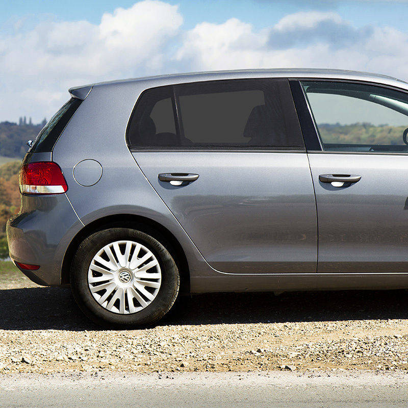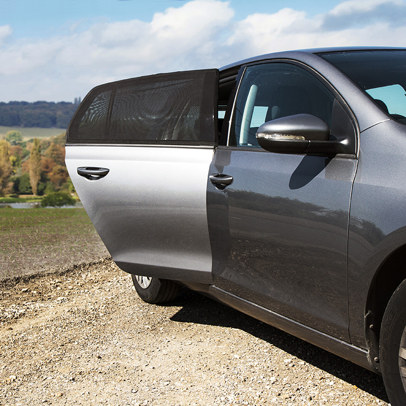 Elastické přetahovací sluneční clony na zadní dveře auta. Clony jsou dodávány v páru. Jsou vyrobeny z elastické tmavé síťoviny, která pohlcuje 70% UV paprsků, ale stále je přes ní dobře vidět. Výhodou této přetahovací clony je možnost otevřeného okna. Textilie se snadno pere.