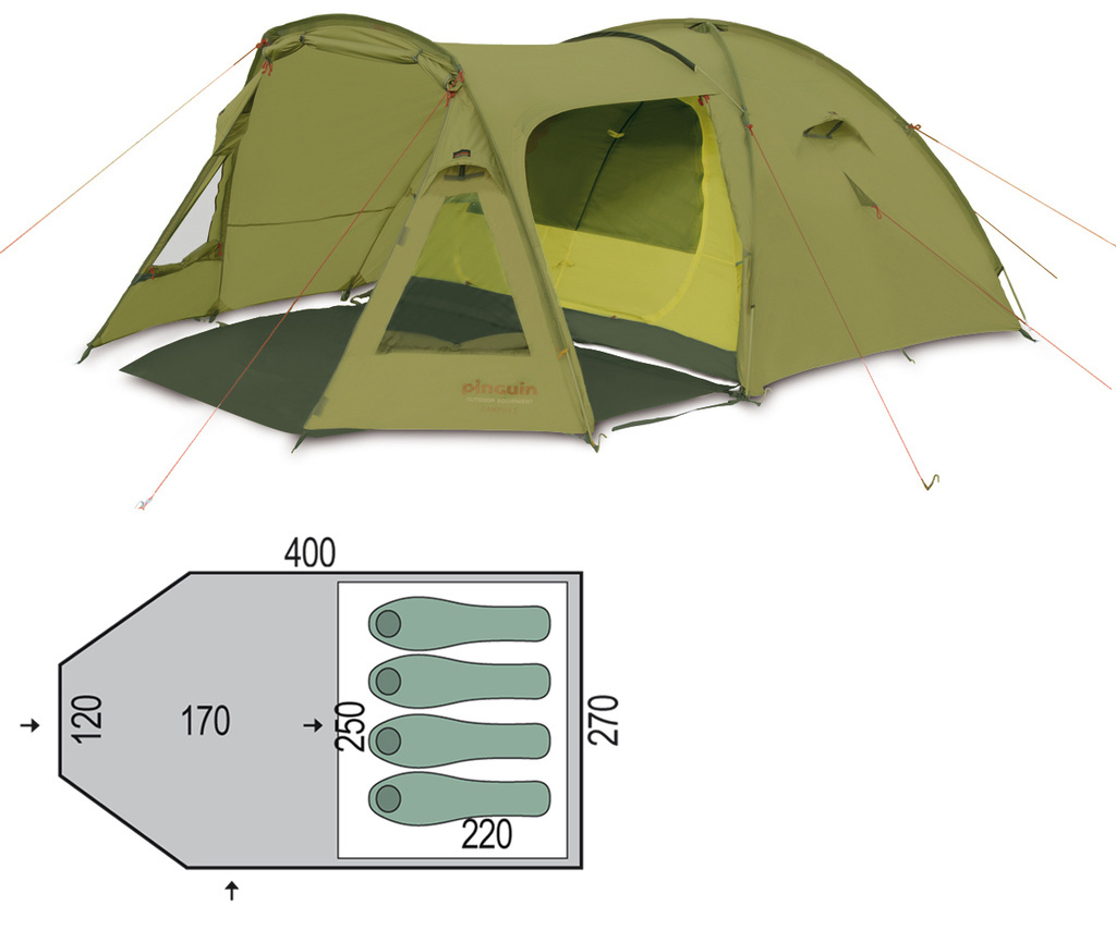 Prostorný stan Pinguin Campus 4 duralu pro čtyři osoby s velkou variabilitou vchodů, duralovými pruty a rozměrnou předsíní zachovává výhodu malých stanů – snadnou a rychlou stavbu.