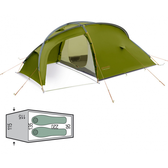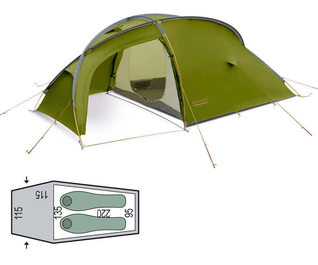 Samonosný dvoumístný stan Pinguin Summit 2 se dvěma bočními vchody a jednou předsíňkou.