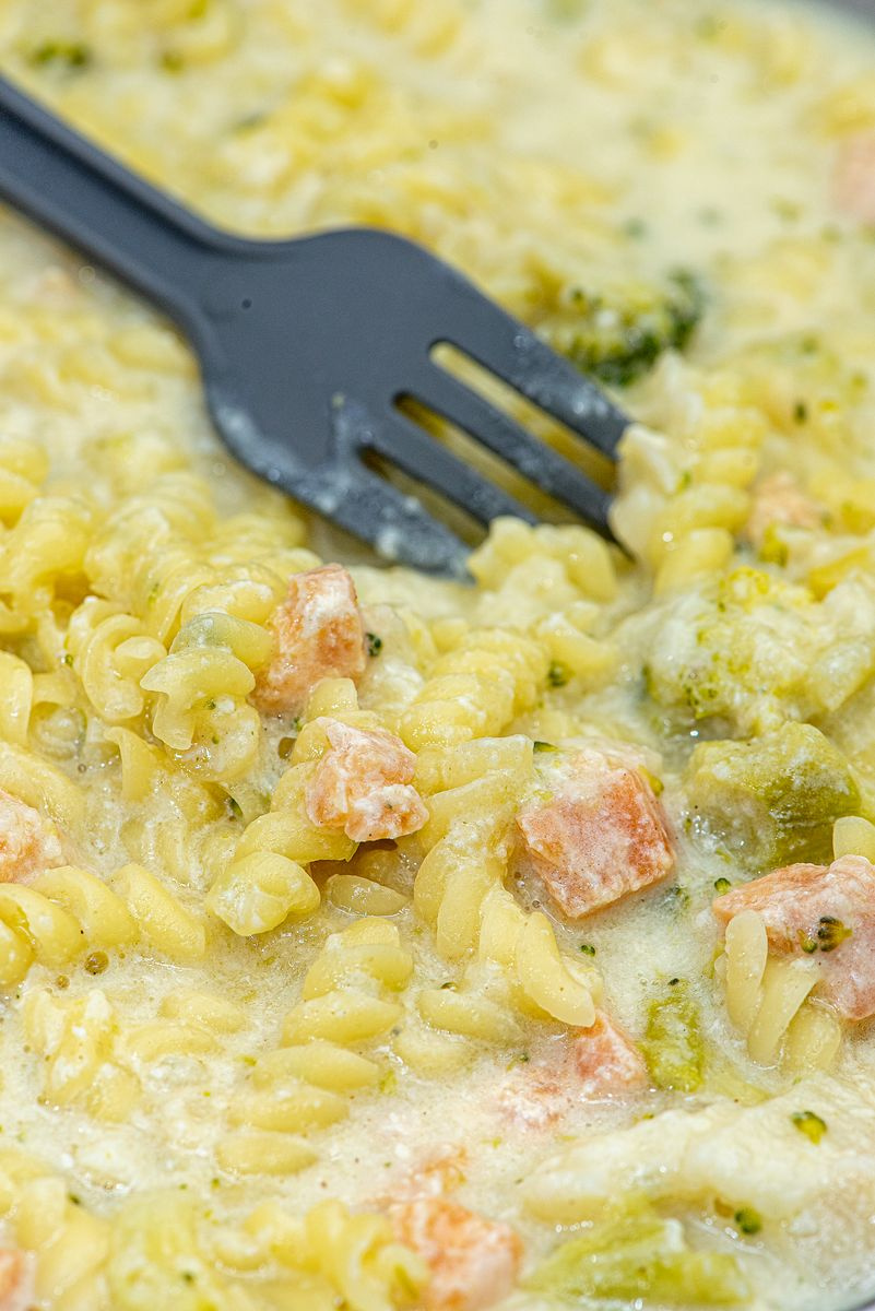 Těstoviny (pšenice) (42%), mléko, nízkotučná smetana (mléko), růžový losos (ryby) (9%), cibule, brokolice (6%), řepkový olej, kukuřičná mouka, sůl, bílý pepř. Alergeny vyznačeny tučně.