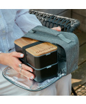 Box na svačinu Bento se dvěma přihrádkami, který se dodává s odpovídající izolační taškou. Součástí je i boční kapsa na zip pro uložení příboru AKINOD.