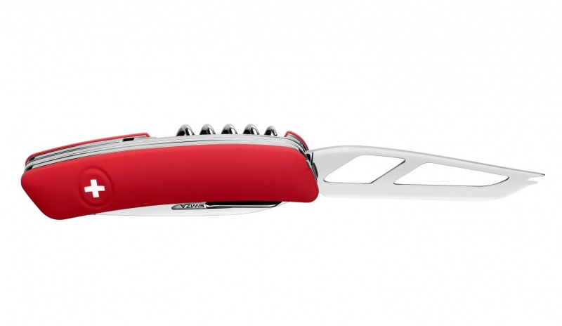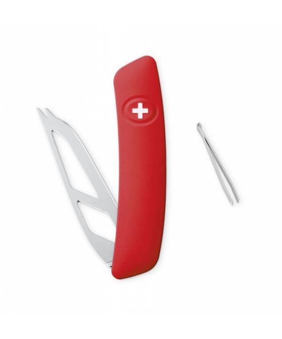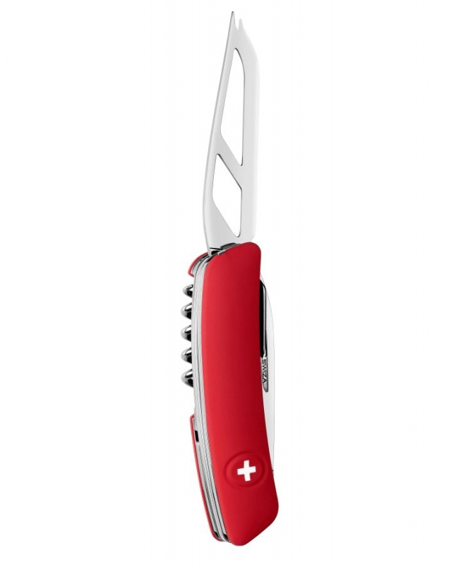 autentický švýcarský kapesní nůž speciálně konstruovaný pro milovníky sýrů s ergonomickou červenou střenkou s měkkým úchopem a integrovanou pojistkou, nerezovou čepelí s otvory bránícími přilepení sýru a pinzetouVíce