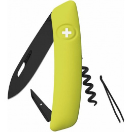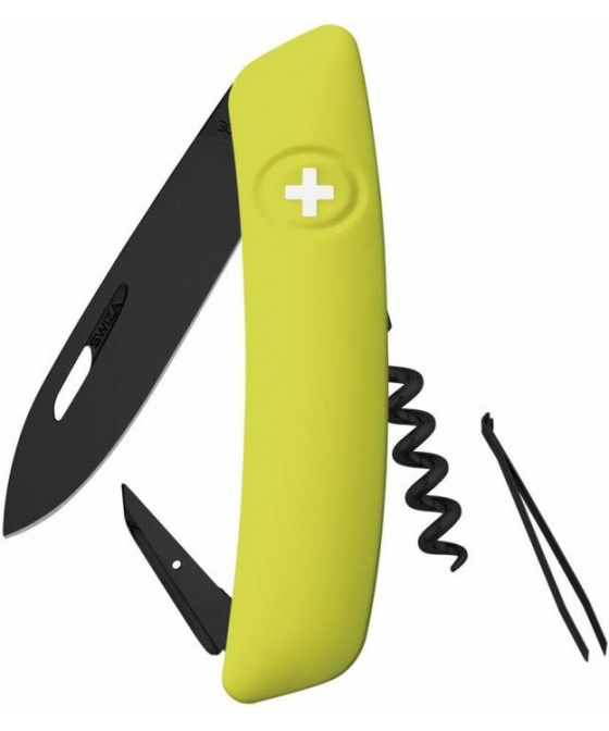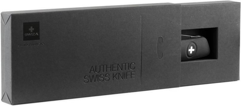 autentický švýcarský kapesní nůž pocházející z obnovené výroby ve známé továrně v Delémontu, hlavním a největším městě kantonu Jura revoluční tvar a střenka nabízející měkký úchop dělají z tohoto nože nejpohodlnější a nejsnadněji použitelný nůž vůbec pojistka integrovaná přímo do střenky nože je chráněna měkkou pryží pojistku aktivujete pouhým stisknutím loga Swiza na střence ergonomicky zakřivený tvar nože umožňuje lepší a snadnější přístup k nástrojům díky nehetníku na každé čepeli lze nůž dobře otevřít levou nebo pravou rukou délka čepele 75 mm a střenky 95 mm čepel potažená černou vrstvou PVD je vyrobena z kvalitní extra odolné nerezové oceli 440 s tvrdostí 57 HRc baleno v dárkovém boxu nástroje: nerezová čepel s nehetníkem výstružník, šídlo vývrtka pinzeta