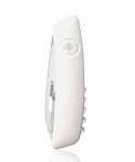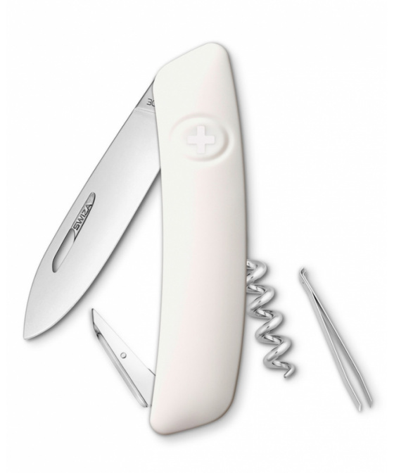 autentický švýcarský kapesní nůž s bílou ergonomickou střenkou s měkkým úchopem a integrovanou pojistkou, nerezovou čepelí s nehetníkem pro praváky i leváky, vývrtkou a pinzetouVíce
