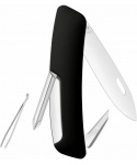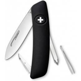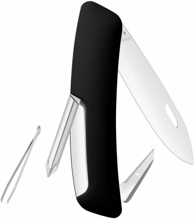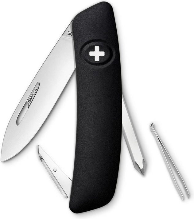 autentický švýcarský kapesní nůž pocházející z obnovené výroby ve známé továrně v Delémontu, hlavním a největším městě kantonu Jura revoluční tvar a střenka nabízející měkký úchop dělají z tohoto nože nejpohodlnější a nejsnadněji použitelný nůž vůbec pojistka integrovaná přímo do střenky nože je chráněna měkkou pryží pojistku aktivujete pouhým stisknutím loga Swiza na střence ergonomicky zakřivený tvar nože umožňuje lepší a snadnější přístup k nástrojům díky nehetníku na každé čepeli lze nůž dobře otevřít levou nebo pravou rukou délka čepele 75 mm a střenky 95 mm čepel je vyrobena z kvalitní extra odolné nerezové oceli 440 s tvrdostí 57 HRc baleno v plastovém boxu nástroje: nerezová čepel s nehetníkem výstružník, šídlo křížový šroubovák No 1 pinzeta