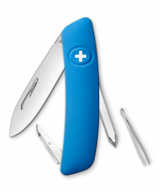 autentický švýcarský kapesní nůž s modrou ergonomickou střenkou s měkkým úchopem a integrovanou pojistkou, nerezovou čepelí s nehetníkem pro praváky i leváky, křížovým šroubovákem a pinzetouVíce
