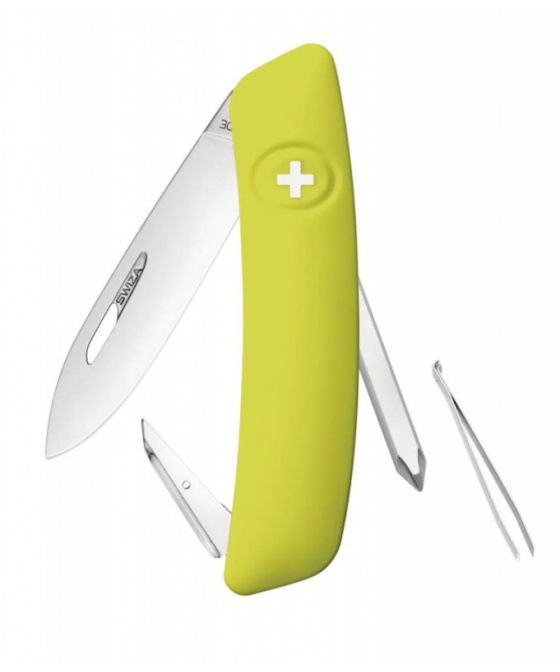 autentický švýcarský kapesní nůž s limetkově zelenou ergonomickou střenkou s měkkým úchopem a integrovanou pojistkou, nerezovou čepelí s nehetníkem pro praváky i leváky, křížovým šroubovákem a pinzetouVíce