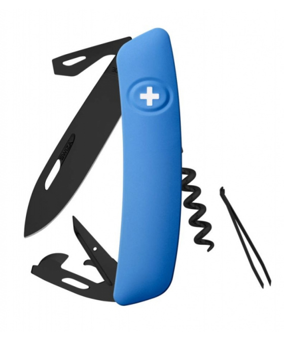 autentický švýcarský kapesní nůž s modrou ergonomickou střenkou s měkkým úchopem a integrovanou pojistkou, černěnou nerezovou čepelí s nehetníkem pro praváky i leváky, vývrtkou, otvíráky, plochým šroubovákem a pinzetou balený v dárkovém boxuVíce