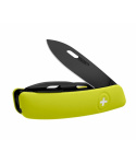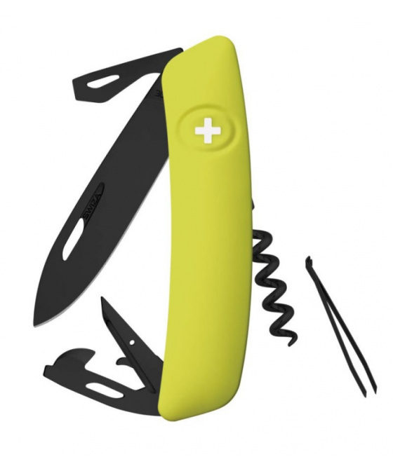 autentický švýcarský kapesní nůž s limetkově zelenou ergonomickou střenkou s měkkým úchopem a integrovanou pojistkou, černěnou nerezovou čepelí s nehetníkem pro praváky i leváky, vývrtkou, otvíráky, plochým šroubovákem a pinzetou balený v dárkovém boxuVíce