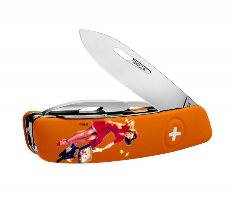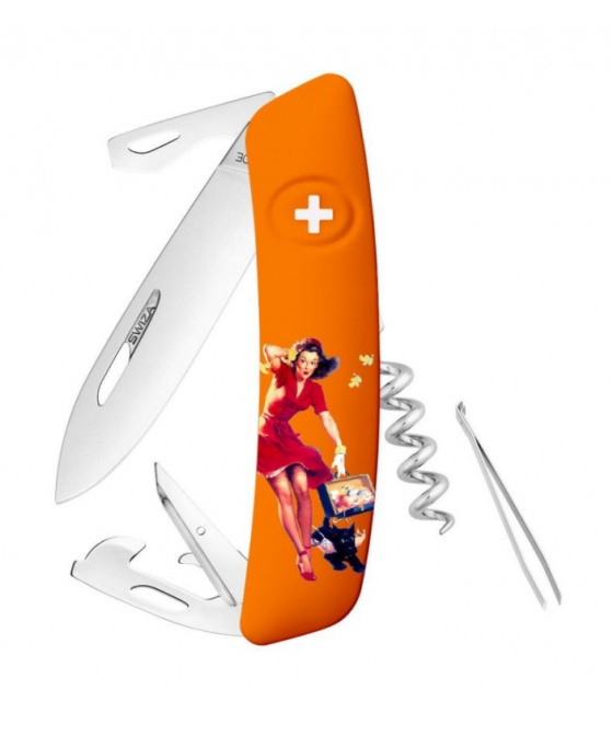 -autentický švýcarský kapesní nůž pocházející z obnovené výroby ve známé továrně v Delémontu, hlavním a největším městě kantonu Jura -kreslený motiv pin-up girl - modelky, která pózuje na masově produkovaných atraktivně vypadajících fotografiích, které jsou součástí tzv. pop kultury -revoluční tvar a střenka nabízející měkký úchop dělají z tohoto nože nejpohodlnější a nejsnadněji použitelný nůž vůbec -pojistka integrovaná přímo do střenky nože je chráněna měkkou pryží -pojistku aktivujete pouhým stisknutím loga Swiza na střence -ergonomicky zakřivený tvar nože umožňuje lepší a snadnější přístup k nástrojům -díky nehetníku na každé čepeli lze nůž dobře otevřít levou nebo pravou rukou -délka čepele 75 mm a střenky 95 mm -čepel je vyrobena z kvalitní extra odolné nerezové oceli 440 s tvrdostí 57 HRc -baleno v dárkovém boxu