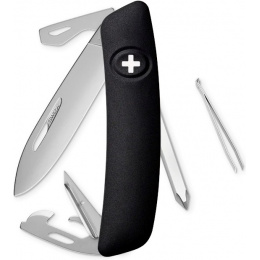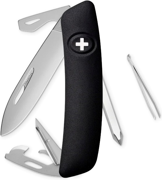 autentický švýcarský kapesní nůž vyrobený společností Helvetica Brands SA se sídlem v kantonu a městě Jura na pomezí Francie a Švýcarska revoluční tvar a střenka nabízející měkký úchop dělají z tohoto nože nejpohodlnější a nejsnadněji použitelný nůž vůbec ergonomicky zakřivený tvar nože umožňuje lepší a snadnější přístup k nástrojům čepel s matným povrchem o délce 75 mm je vyrobena z nerezové oceli 440 s tvrdostí 57 HRC díky nehetníku na každé čepeli lze nůž dobře otevřít levou nebo pravou rukou pojistka chráněná odolnou pryží je integrovaná přímo do střenky a aktivuje se pouhým stisknutím loga Swiza na střence baleno v dárkovém boxu Nástroje: nerezová čepel s nehetníkem bezpečnostní pojistka křížový šroubovák No 1-3 výstružník šídlo s očkem na šití otvírák na lahve se šroubovákem No 3 otvírák na konzervy se šroubovákem No 1 pinzeta o délce 75 mm
