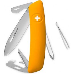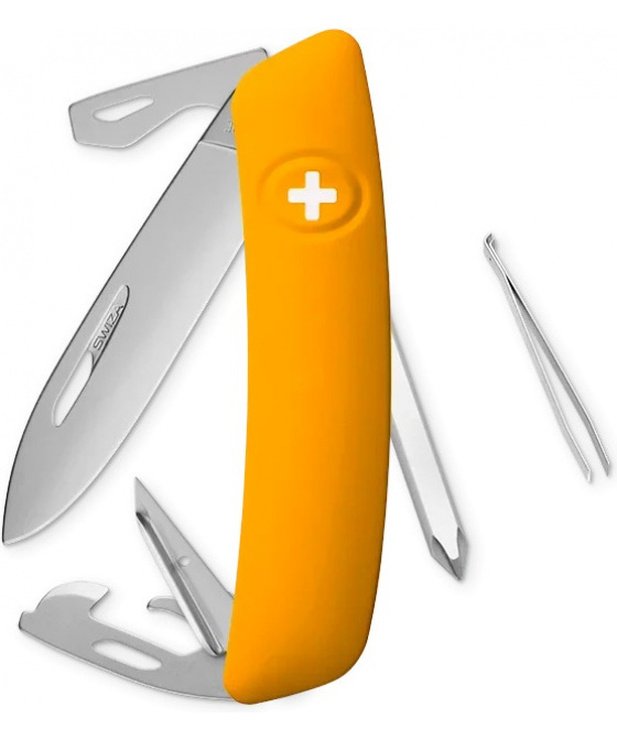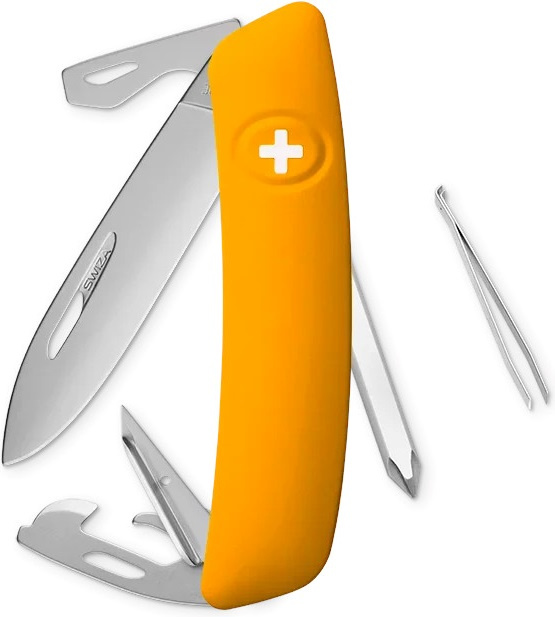 autentický švýcarský kapesní nůž vyrobený společností Helvetica Brands SA se sídlem v kantonu a městě Jura na pomezí Francie a Švýcarska revoluční tvar a střenka nabízející měkký úchop dělají z tohoto nože nejpohodlnější a nejsnadněji použitelný nůž vůbec ergonomicky zakřivený tvar nože umožňuje lepší a snadnější přístup k nástrojům čepel s matným povrchem o délce 75 mm je vyrobena z nerezové oceli 440 s tvrdostí 57 HRC díky nehetníku na každé čepeli lze nůž dobře otevřít levou nebo pravou rukou pojistka chráněná odolnou pryží je integrovaná přímo do střenky a aktivuje se pouhým stisknutím loga Swiza na střence baleno v dárkovém boxu Nástroje: nerezová čepel s nehetníkem bezpečnostní pojistka křížový šroubovák No 1-3 výstružník šídlo s očkem na šití otvírák na lahve se šroubovákem No 3 otvírák na konzervy se šroubovákem No 1 pinzeta o délce 75 mm