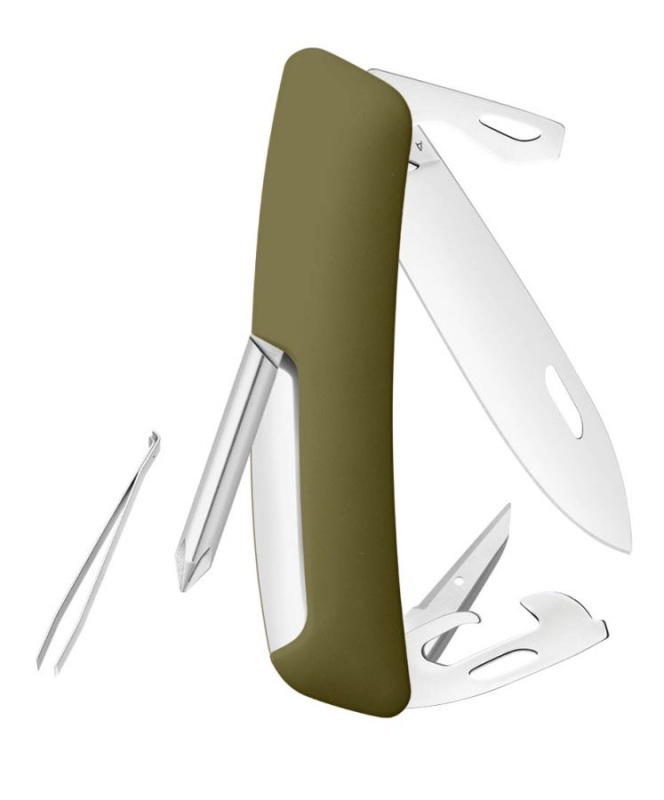 autentický švýcarský kapesní nůž s olivovou ergonomickou střenkou s měkkým úchopem a integrovanou pojistkou, nerezovou čepelí s nehetníkem pro praváky i leváky, křížovým šroubovákem, otvíráky, plochým šroubovákem a pinzetouVíce