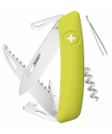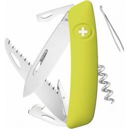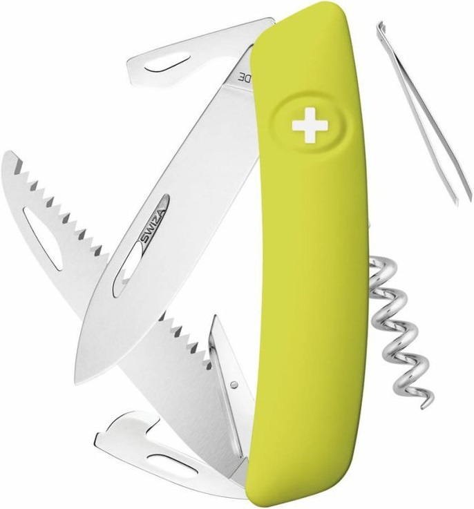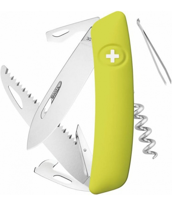autentický švýcarský kapesní nůž pocházející z obnovené výroby ve známé továrně v Delémontu, hlavním a největším městě kantonu Jura revoluční tvar a střenka nabízející měkký úchop dělají z tohoto nože nejpohodlnější a nejsnadněji použitelný nůž vůbec pojistka integrovaná přímo do střenky nože je chráněna měkkou pryží pojistku aktivujete pouhým stisknutím loga Swiza na střence ergonomicky zakřivený tvar nože umožňuje lepší a snadnější přístup k nástrojům díky nehetníku na každé čepeli lze nůž dobře otevřít levou nebo pravou rukou délka čepele 75 mm a střenky 95 mm čepel je vyrobena z kvalitní extra odolné nerezové oceli 440 s tvrdostí 57 HRc robustní nerezová pilka pro čistý a přesný řez, jejíž geometrie stoupání směrem vzhůru zajišťuje vysoký výkon při řezání bez zatížení baleno v boxu nástroje: nerezová čepel s nehetníkem pilka výstružník, šídlo otvírák na lahve a otvírák na konzervy odstraňovač izolace z drátů plochý šroubovák No 1 vývrtka pinzeta