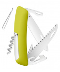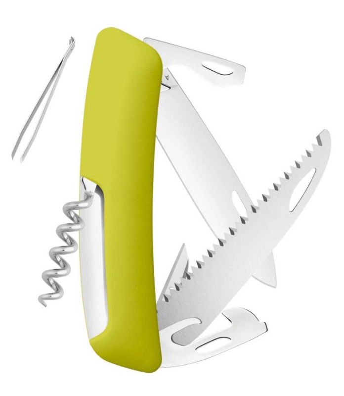 autentický švýcarský kapesní nůž s limetkově zelenou ergonomickou střenkou s měkkým úchopem a integrovanou pojistkou, nerezovou čepelí s nehetníkem pro praváky i leváky, pilkou, vývrtkou, otvíráky, plochým šroubovákem a pinzetouVíce