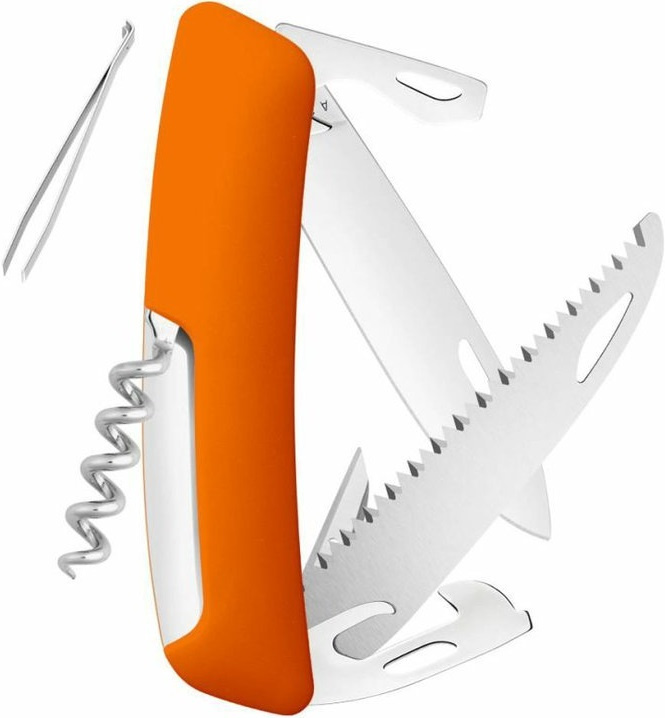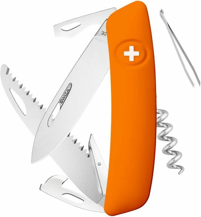 autentický švýcarský kapesní nůž pocházející z obnovené výroby ve známé továrně v Delémontu, hlavním a největším městě kantonu Jura revoluční tvar a střenka nabízející měkký úchop dělají z tohoto nože nejpohodlnější a nejsnadněji použitelný nůž vůbec pojistka integrovaná přímo do střenky nože je chráněna měkkou pryží pojistku aktivujete pouhým stisknutím loga Swiza na střence ergonomicky zakřivený tvar nože umožňuje lepší a snadnější přístup k nástrojům díky nehetníku na každé čepeli lze nůž dobře otevřít levou nebo pravou rukou délka čepele 75 mm a střenky 95 mm čepel je vyrobena z kvalitní extra odolné nerezové oceli 440 s tvrdostí 57 HRc robustní nerezová pilka pro čistý a přesný řez, jejíž geometrie stoupání směrem vzhůru zajišťuje vysoký výkon při řezání bez zatížení baleno v boxu nástroje: nerezová čepel s nehetníkem pilka výstružník, šídlo otvírák na lahve a otvírák na konzervy odstraňovač izolace z drátů plochý šroubovák No 1 vývrtka pinzeta