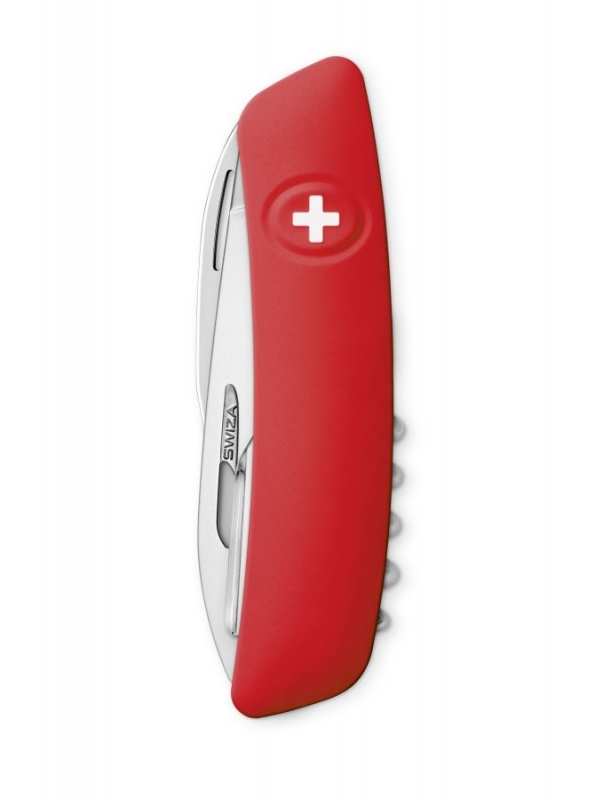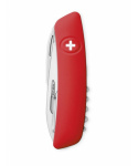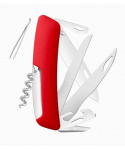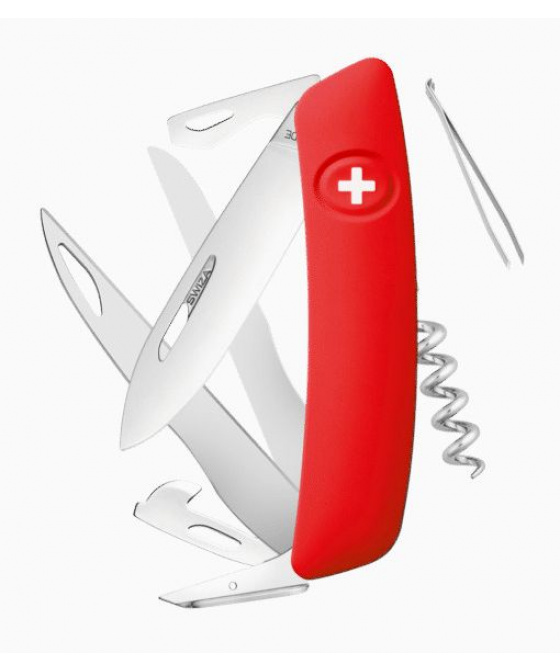 autentický švýcarský kapesní nůž s červenou ergonomickou střenkou s měkkým úchopem a integrovanou pojistkou, nerezovou čepelí s nehetníkem pro praváky i leváky, nůžkami, vývrtkou, otvíráky a pinzetouVíce