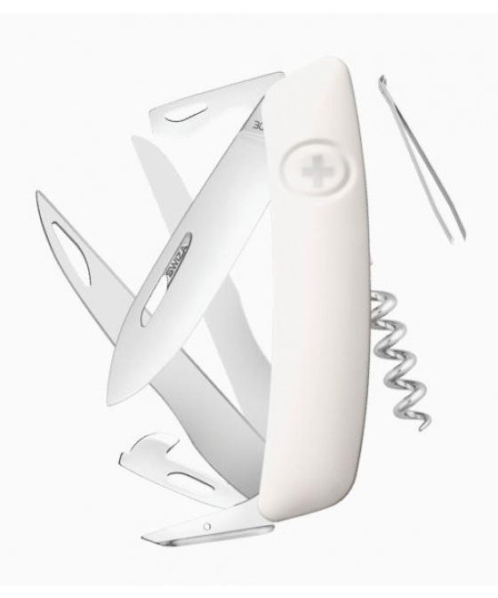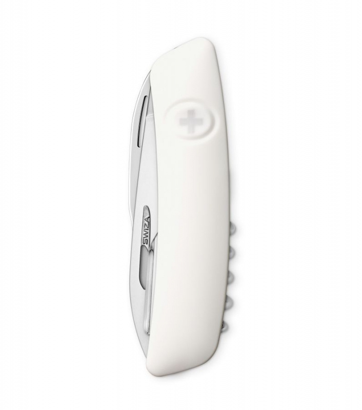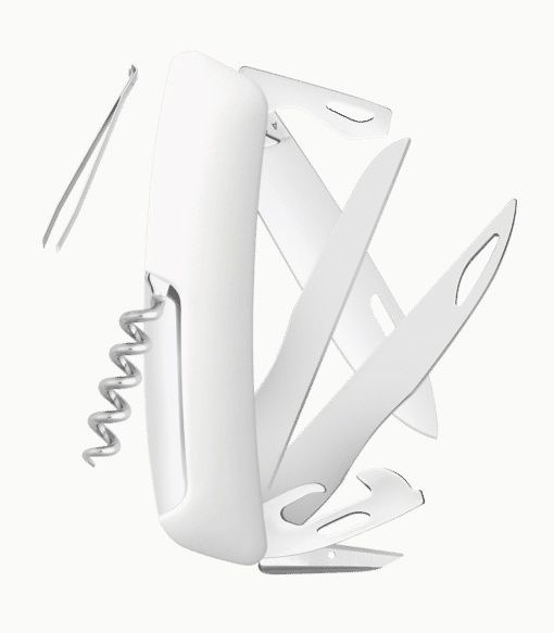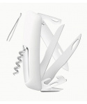 autentický švýcarský kapesní nůž s bílou ergonomickou střenkou s měkkým úchopem a integrovanou pojistkou, nerezovou čepelí s nehetníkem pro praváky i leváky, nůžkami, vývrtkou, otvíráky a pinzetouVíce