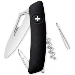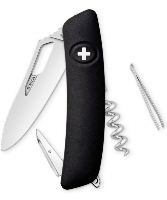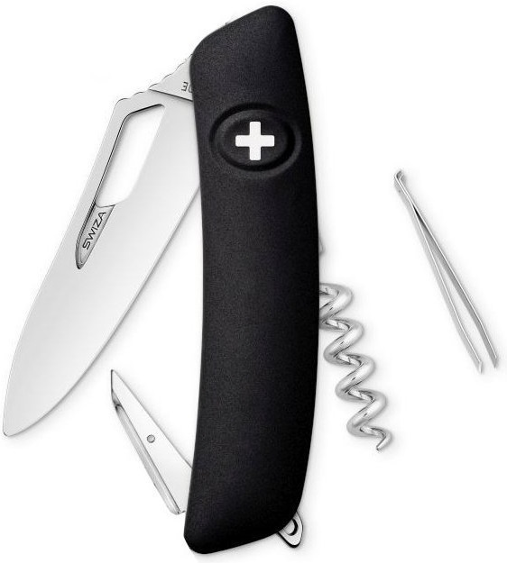 autentický švýcarský kapesní nůž pocházející z obnovené výroby ve známé továrně v Delémontu, hlavním a největším městě kantonu Jura revoluční tvar a střenka nabízející měkký úchop dělají z tohoto nože nejpohodlnější a nejsnadněji použitelný nůž vůbec pojistka integrovaná přímo do střenky nože je chráněna měkkou pryží pojistku aktivujete pouhým stisknutím loga Swiza na střence ergonomicky zakřivený tvar nože umožňuje lepší a snadnější přístup k nástrojům čepel otvíratelná jednou rukou je vyrobena z kvalitní extra odolné nerezové oceli 440 s tvrdostí 57 HRc délka čepele 75 mm a střenky 95 mm čepel je vyrobena z kvalitní extra odolné nerezové oceli 440 s tvrdostí 57 HRc kroužek baleno v boxu nástroje: nerezová čepel s nehetníkem výstružník, šídlo vývrtka pinzeta kroužek