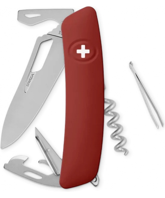 autentický švýcarský kapesní nůž vyrobený společností Helvetica Brands SA se sídlem v kantonu a městě Jura na pomezí Francie a Švýcarska revoluční tvar a střenka nabízející měkký úchop dělají z tohoto nože nejpohodlnější a nejsnadněji použitelný nůž vůbec ergonomicky zakřivený tvar nože umožňuje lepší a snadnější přístup k nástrojům čepel s matným povrchem o délce 75 mm otevíratelná jednou rukou je vyrobena z nerezové oceli 440 s tvrdostí 57 HRC pojistka chráněná odolnou pryží je integrovaná přímo do střenky a aktivuje se pouhým stisknutím loga Swiza na střence baleno v dárkovém boxu Nástroje: nerezová čepel otevíratelná jednou rukou bezpečnostní pojistka someliérská vývrtka s 5 otáčkami oko pro upevnění kroužku na klíče výstružník šídlo s očkem na šití otvírák na lahve se šroubovákem No 3 otvírák na konzervy se šroubovákem No 1 pinzeta o délce 75 mm