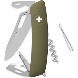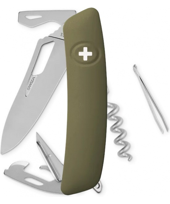 autentický švýcarský kapesní nůž vyrobený společností Helvetica Brands SA se sídlem v kantonu a městě Jura na pomezí Francie a Švýcarska revoluční tvar a střenka nabízející měkký úchop dělají z tohoto nože nejpohodlnější a nejsnadněji použitelný nůž vůbec ergonomicky zakřivený tvar nože umožňuje lepší a snadnější přístup k nástrojům čepel s matným povrchem o délce 75 mm otevíratelná jednou rukou je vyrobena z nerezové oceli 440 s tvrdostí 57 HRC pojistka chráněná odolnou pryží je integrovaná přímo do střenky a aktivuje se pouhým stisknutím loga Swiza na střence baleno v dárkovém boxu Nástroje: nerezová čepel otevíratelná jednou rukou bezpečnostní pojistka someliérská vývrtka s 5 otáčkami oko pro upevnění kroužku na klíče výstružník šídlo s očkem na šití otvírák na lahve se šroubovákem No 3 otvírák na konzervy se šroubovákem No 1 pinzeta o délce 75 mmVíce