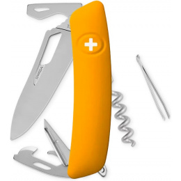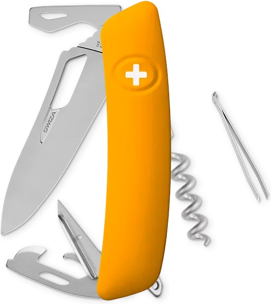 autentický švýcarský kapesní nůž vyrobený společností Helvetica Brands SA se sídlem v kantonu a městě Jura na pomezí Francie a Švýcarska revoluční tvar a střenka nabízející měkký úchop dělají z tohoto nože nejpohodlnější a nejsnadněji použitelný nůž vůbec ergonomicky zakřivený tvar nože umožňuje lepší a snadnější přístup k nástrojům čepel s matným povrchem o délce 75 mm otevíratelná jednou rukou je vyrobena z nerezové oceli 440 s tvrdostí 57 HRC pojistka chráněná odolnou pryží je integrovaná přímo do střenky a aktivuje se pouhým stisknutím loga Swiza na střence baleno v dárkovém boxu Nástroje: nerezová čepel otevíratelná jednou rukou bezpečnostní pojistka someliérská vývrtka s 5 otáčkami oko pro upevnění kroužku na klíče výstružník šídlo s očkem na šití otvírák na lahve se šroubovákem No 3 otvírák na konzervy se šroubovákem No 1 pinzeta o délce 75 mm