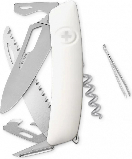 autentický švýcarský kapesní nůž vyrobený společností Helvetica Brands SA se sídlem v kantonu a městě Jura na pomezí Francie a Švýcarska revoluční tvar a střenka nabízející měkký úchop dělají z tohoto nože nejpohodlnější a nejsnadněji použitelný nůž vůbec ergonomicky zakřivený tvar nože umožňuje lepší a snadnější přístup k nástrojům čepel s matným povrchem o délce 75 mm otevíratelná jednou rukou je vyrobena z nerezové oceli 440 s tvrdostí 57 HRC pojistka chráněná odolnou pryží je integrovaná přímo do střenky a aktivuje se pouhým stisknutím loga Swiza na střence nerezová pilka s 31 zuby pro čistý a přesný řez, jejíž geometrie stoupání směrem vzhůru zajišťuje vysoký výkon při řezání bez zatížení baleno v dárkovém boxu Nástroje: nerezová čepel otevíratelná jednou rukou bezpečnostní pojistka someliérská vývrtka s 5 otáčkami výstružník šídlo s očkem na šití otvírák na lahve se šroubovákem No 3 otvírák na konzervy se šroubovákem No 1 pilka na dřevo oko pro upevnění kroužku na klíče pinzeta o délce 75 mm