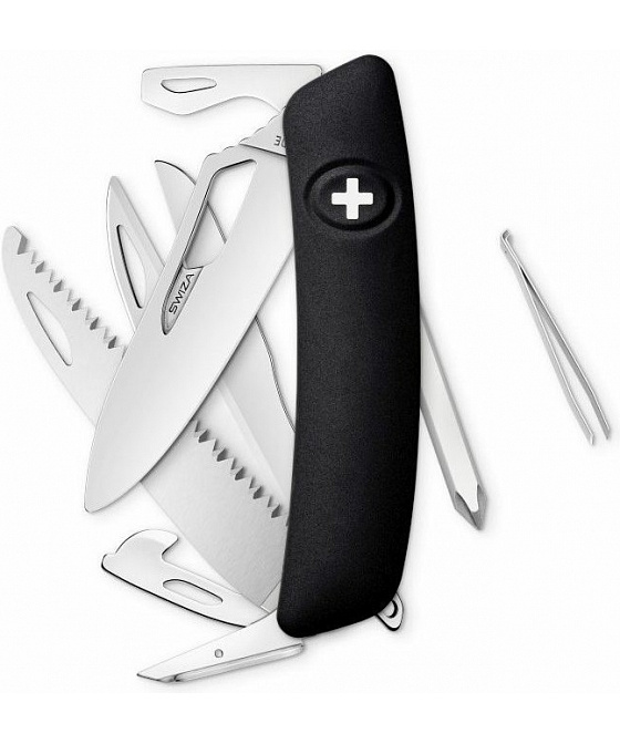 autentický švýcarský kapesní nůž pocházející z obnovené výroby ve známé továrně v Delémontu, hlavním a největším městě kantonu Jura revoluční tvar a střenka nabízející měkký úchop dělají z tohoto nože nejpohodlnější a nejsnadněji použitelný nůž vůbec pojistka integrovaná přímo do střenky nože je chráněna měkkou pryží pojistku aktivujete pouhým stisknutím loga Swiza na střence ergonomicky zakřivený tvar nože umožňuje lepší a snadnější přístup k nástrojům čepel otvíratelná jednou rukou je vyrobena z kvalitní extra odolné nerezové oceli 440 s tvrdostí 57 HRc délka čepele 75 mm a střenky 95 mm čepel na vyřezávání o délce 75 mm nerezová pilka pro čistý a přesný řez, jejíž geometrie stoupání směrem vzhůru zajišťuje vysoký výkon při řezání bez zatížení robustní nůžky oko pro upevnění kroužku na klíče baleno v boxu nástroje: nerezová čepel s nehetníkem nůžky pilka výstružník, šídlo otvírák na lahve otvírák na konzervy s jemným plochým šroubovákem odstraňovač izolace z drátů křížový šroubovák No 3 vývrtka pinzeta