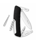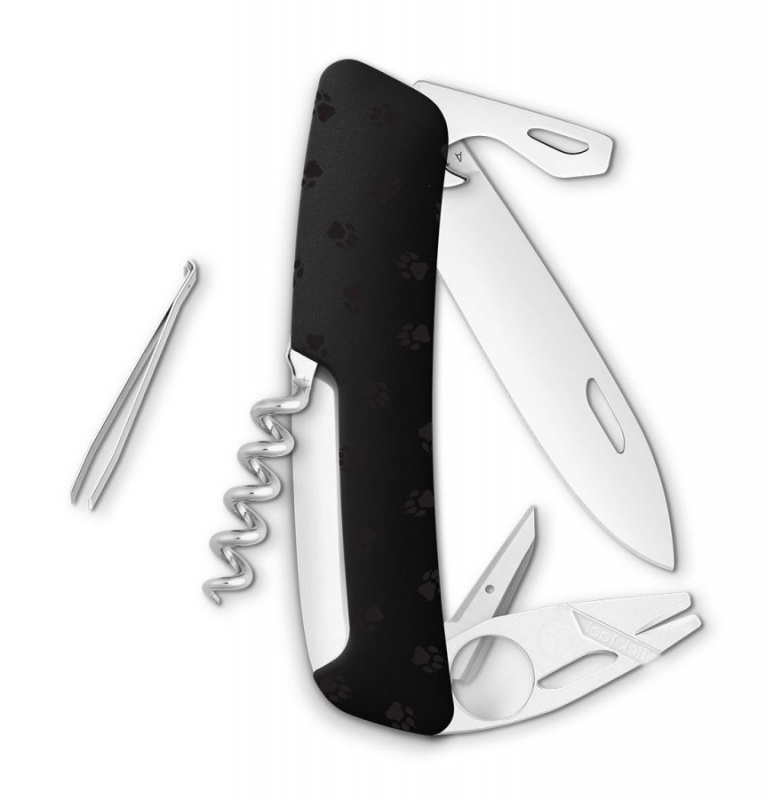 autentický švýcarský kapesní nůž s motivem volně žijících divokých zvířat Afriky a Severní Ameriky s nástrojem pro odstranění klíšťat a lupou, černou ergonomickou střenkou s integrovanou pojistkou, nerezovou čepelí s nehetníkem pro praváky i leváky, vývrtVíce