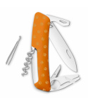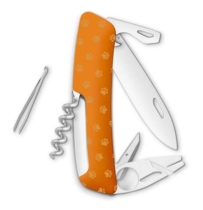 autentický švýcarský kapesní nůž s motivem volně žijících divokých zvířat Afriky a Severní Ameriky s nástrojem pro odstranění klíšťat a lupou, oranžovou ergonomickou střenkou s integrovanou pojistkou, nerezovou čepelí s nehetníkem pro praváky i leváky, výVíce