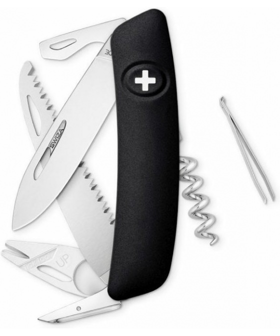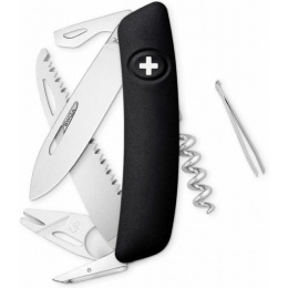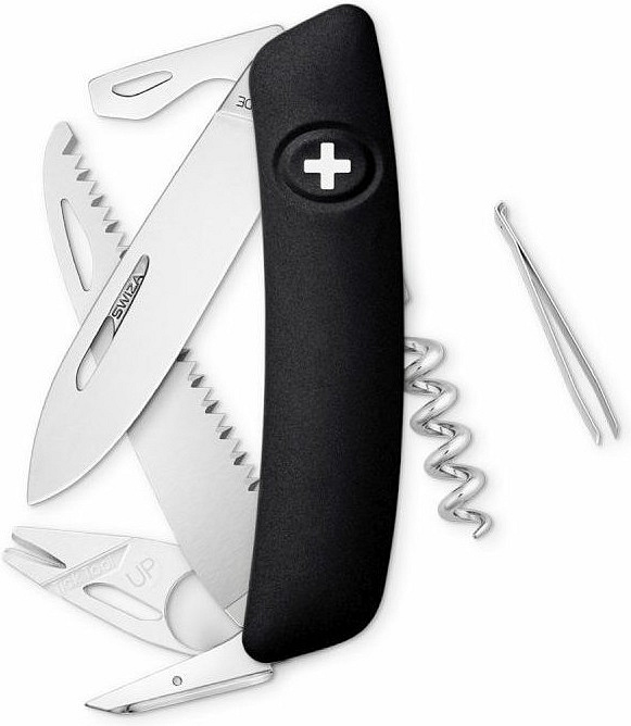 autentický švýcarský kapesní nůž pocházející z obnovené výroby ve známé továrně v Delémontu, hlavním a největším městě kantonu Jura inovativní moderní nůž obsahuje sofistikovaný nástroj s lupou speciálně navržený na odstranění klíšťat klíšťata se mohou stát zdrojem nepříjemných potíží zejména v průběhu jarních a letních i podzimních měsíců při pohybu v travnatých a lesnatých oblastech otvor na plastovém odstraňovači klíšťat umožňuje vyjmutí velkých i velmi malých klíšťat revoluční tvar a střenka nabízející měkký úchop dělají z tohoto nože nejpohodlnější a nejsnadněji použitelný nůž vůbec pojistka integrovaná přímo do střenky nože je chráněna měkkou pryží pojistku aktivujete pouhým stisknutím loga Swiza na střence ergonomicky zakřivený tvar nože umožňuje lepší a snadnější přístup k nástrojům díky nehetníku na každé čepeli lze nůž dobře otevřít levou nebo pravou rukou délka čepele 75 mm a střenky 95 mm čepel je vyrobena z kvalitní extra odolné nerezové oceli 440 s tvrdostí 57 HRc robustní nerezová pilka pro čistý a přesný řez, jejíž geometrie stoupání směrem vzhůru zajišťuje vysoký výkon při řezání bez zatížení baleno v boxu nástroje: nerezová čepel s nehetníkem odstraňovač klíšťat s lupou pilka výstružník, šídlo otvírák na lahve s ohýbaček drátu plochý šroubovák No 3 vývrtka pinzeta