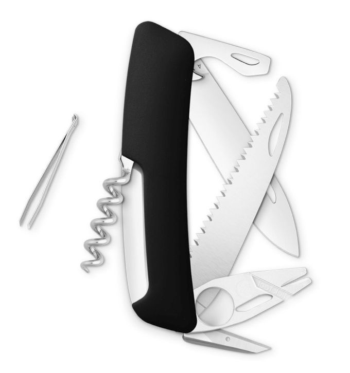 autentický švýcarský kapesní nůž s nástrojem pro odstranění klíšťat a lupou, černou ergonomickou střenkou s měkkým úchopem a integrovanou pojistkou, nerezovou čepelí s nehetníkem pro praváky i leváky, pilkou, vývrtkou, otvírákem na lahve s plochým šroubovVíce