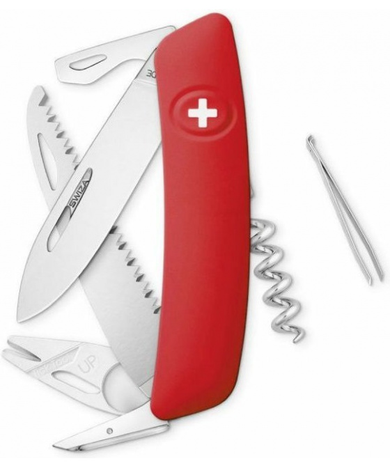 autentický švýcarský kapesní nůž pocházející z obnovené výroby ve známé továrně v Delémontu, hlavním a největším městě kantonu Jura inovativní moderní nůž obsahuje sofistikovaný nástroj s lupou speciálně navržený na odstranění klíšťat klíšťata se mohou stát zdrojem nepříjemných potíží zejména v průběhu jarních a letních i podzimních měsíců při pohybu v travnatých a lesnatých oblastech otvor na plastovém odstraňovači klíšťat umožňuje vyjmutí velkých i velmi malých klíšťat revoluční tvar a střenka nabízející měkký úchop dělají z tohoto nože nejpohodlnější a nejsnadněji použitelný nůž vůbec pojistka integrovaná přímo do střenky nože je chráněna měkkou pryží pojistku aktivujete pouhým stisknutím loga Swiza na střence ergonomicky zakřivený tvar nože umožňuje lepší a snadnější přístup k nástrojům díky nehetníku na každé čepeli lze nůž dobře otevřít levou nebo pravou rukou délka čepele 75 mm a střenky 95 mm čepel je vyrobena z kvalitní extra odolné nerezové oceli 440 s tvrdostí 57 HRc robustní nerezová pilka pro čistý a přesný řez, jejíž geometrie stoupání směrem vzhůru zajišťuje vysoký výkon při řezání bez zatížení baleno v boxu nástroje: nerezová čepel s nehetníkem odstraňovač klíšťat s lupou pilka výstružník, šídlo otvírák na lahve s ohýbaček drátu plochý šroubovák No 3 vývrtka pinzeta