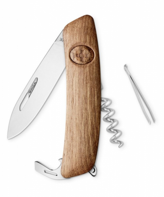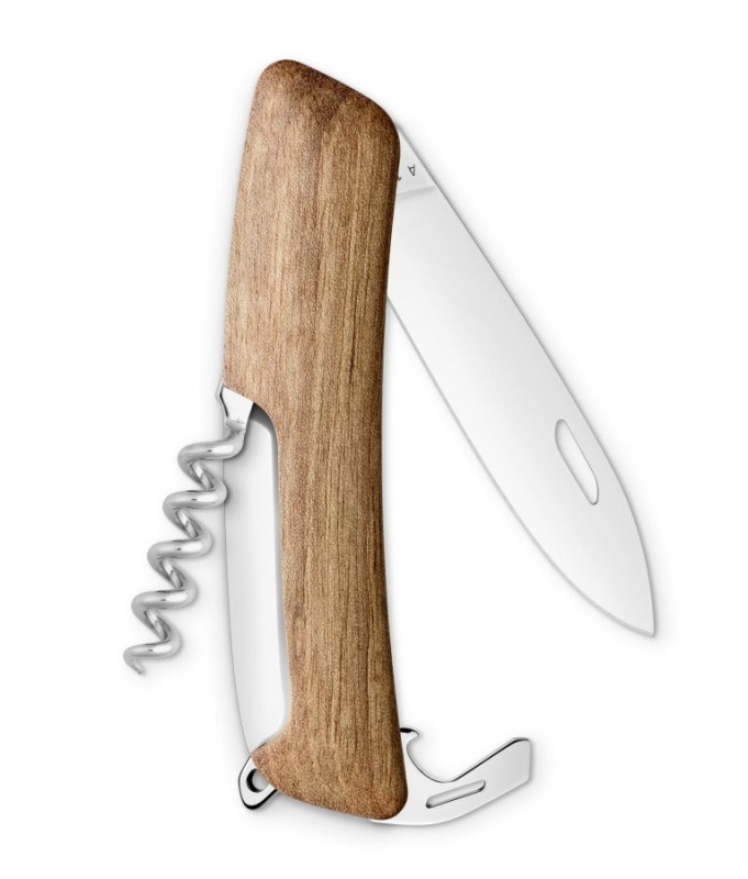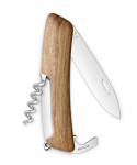autentický švýcarský kapesní nůž pro milovníky vína s ergonomickou střenkou z dubového dřeva a integrovanou pojistkou, nerezovou čepelí pro praváky i leváky, someliérskou vývrtkou, mini otvírákem a pinzetouVíce