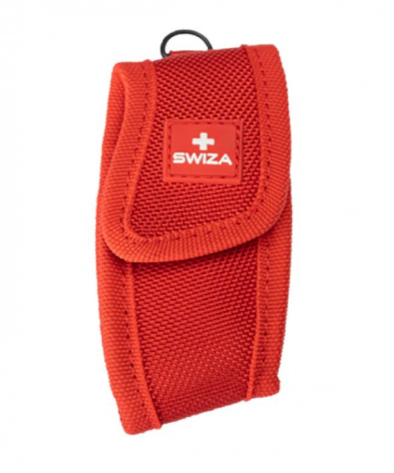 černé nylonové pouzdro pro kapesní nože Swiza s uzavíráním na suchý zip, poutkem na opasek a kovovým polokroužkem pro zavěšení na karabinku