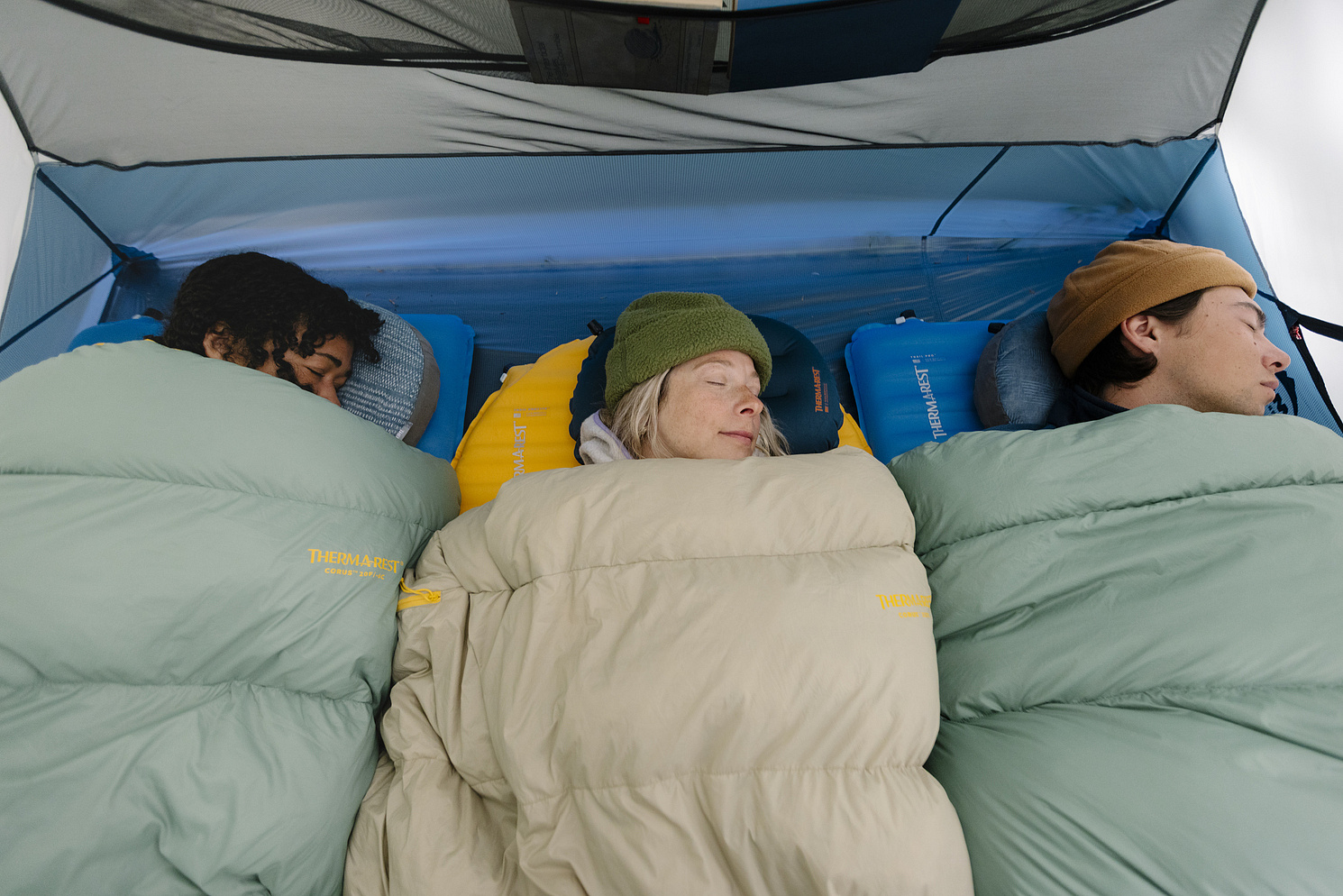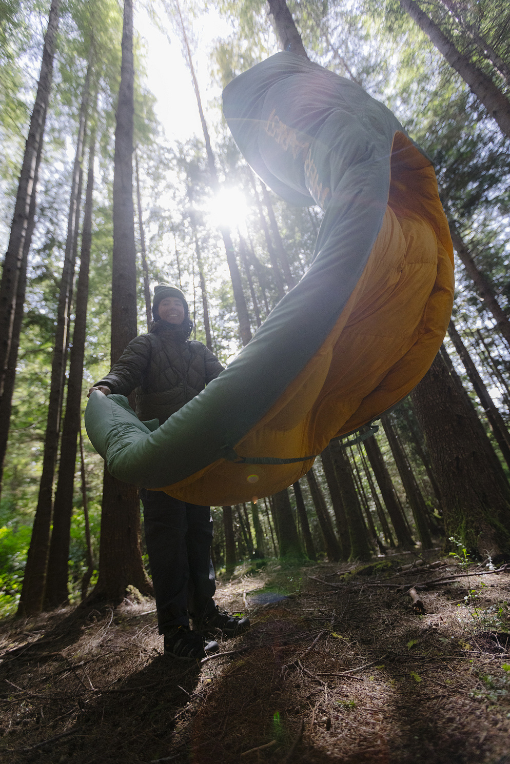 Přesně tvarovaný prostor na nohy lze navléknout přes většinu karimatek pro eliminaci průvanu, nebo jej přetáhnout přímo přes chodidla pro extra teplo.