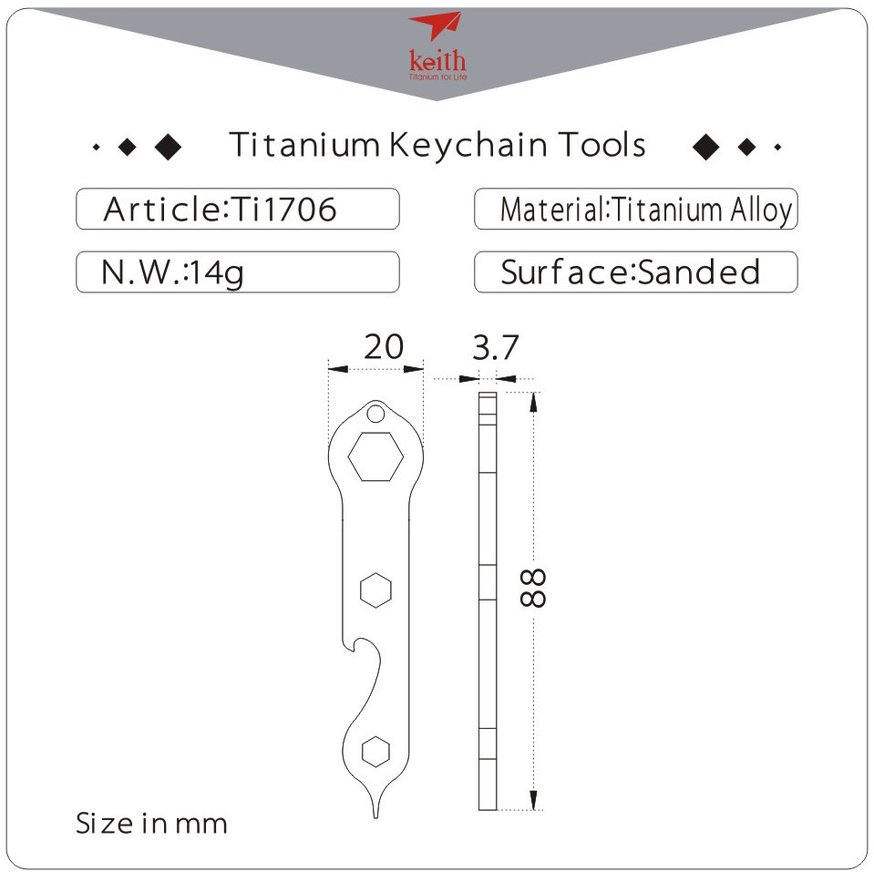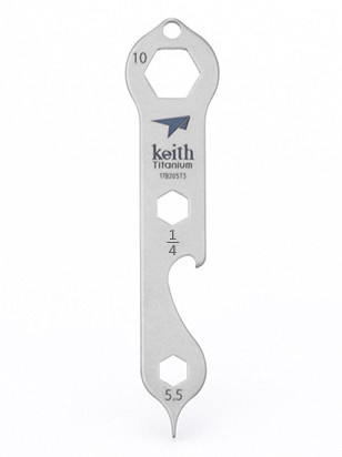 Titanový multifunkční nástroj na klíče 1706 Keith je vynikajícím pomocníkem pro všestranné použití. Má praktické očko na klíče, případně si ho upevníte na provázek u batohu, takže ho nikdy neztratíte a budete ho mít vždycky u sebe. Nejvíce oceníte jeho univerzální používání. Můžete šroubovat, otevírat lahve a k tomu má několik drážek pro klíče nejrůznějších velikostí.