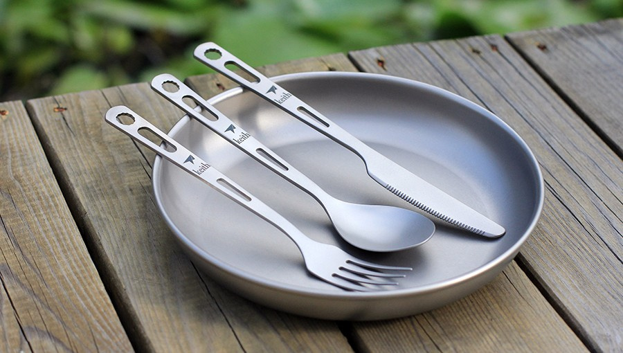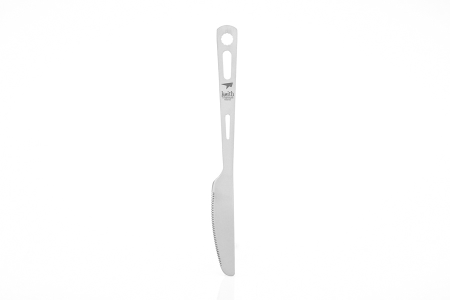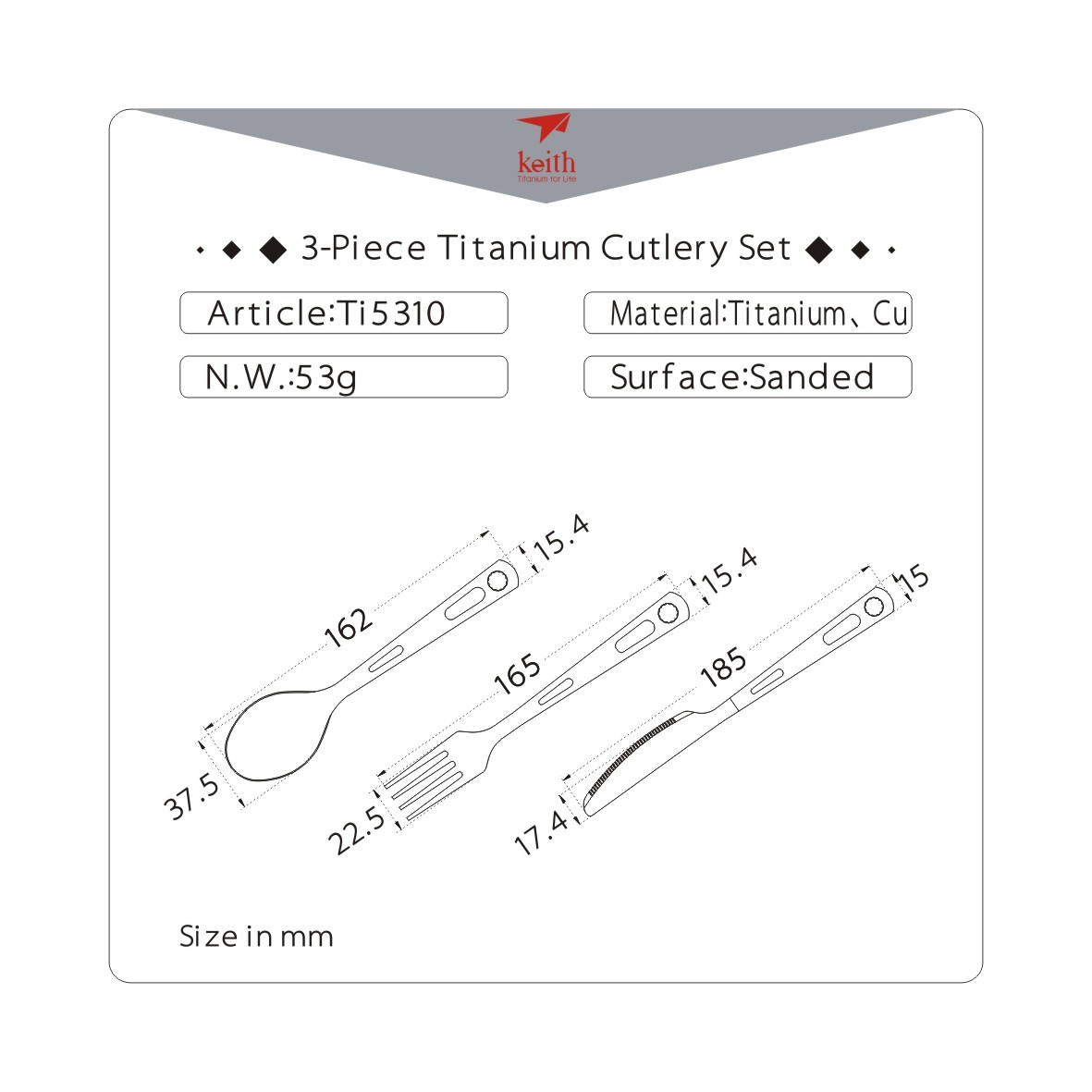 Titanový set Keith Cutlery Set je precizní příbor titanových mistrů vypracovaný k dokonalosti. Celý set je jištěn proti poztrácení titanovou karabinkou a šroubem, díky šroubu a drážkovanému otvoru na konci jednotlivých příboru je možné sešroubovat příbor tak, že vytvoříte extra dlouhou lžíci (nůž, vidličku) "zlodějku" na míchání v hlubokých kotlících nebo vyjídání cestovní stravy z pytlíků.