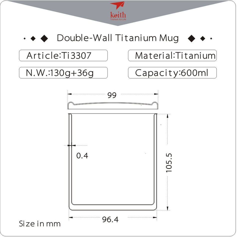 Téměř nezničitlený hrnek z titanu. Precizní z pracování od jednoho z lídrů výroby titanových produktů. Titan je zdravotně nezávadný, netoxický materiál, který je o 50% lehčí než ocel a zároveň o 30% pevnější. Titan odolává teplotám -253°C do +600°C.