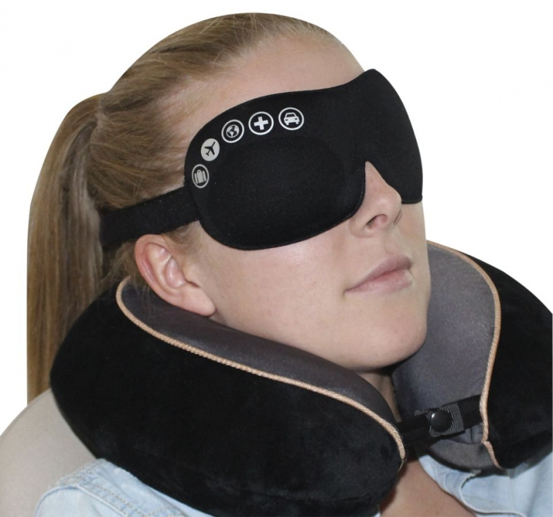 černá tvarovaná oční maska s pěnovou výplní a ucpávkami do uší odpovídající konturám obličeje, nastavitelným pružným páskem se suchým zipem a párem pěnových ucpávekVíce