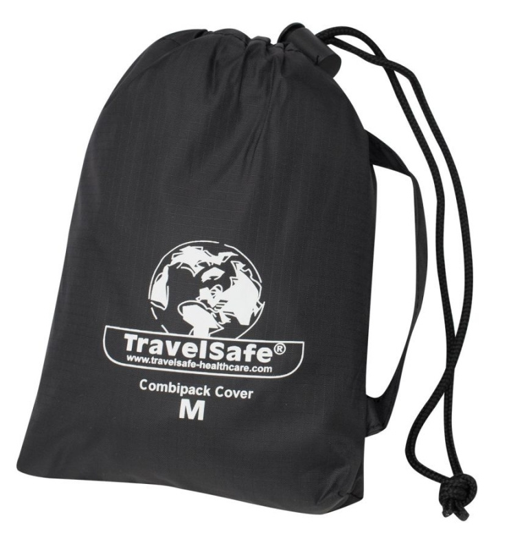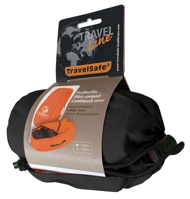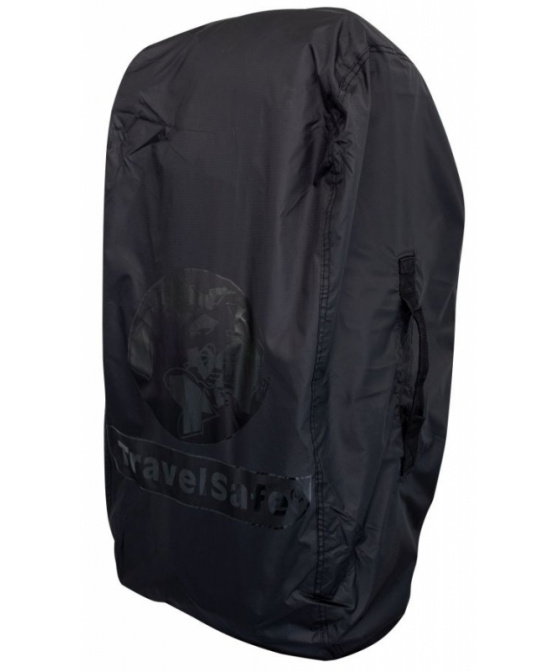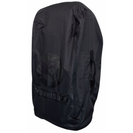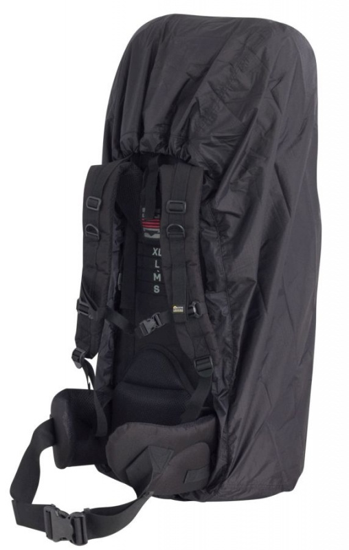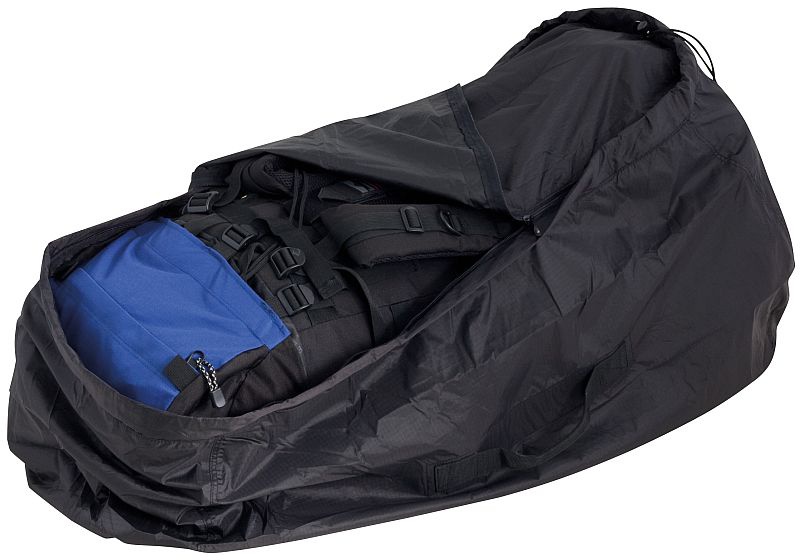 kombinace pláštěnky a ochranného obalu na batoh o objemu do 55l v černém provedení, se stahovací šňůrkou a uzavíráním na zip s rukojetí pro přenášení