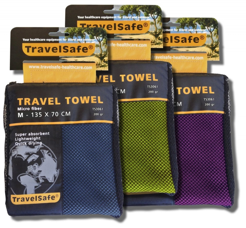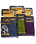 rychleschnoucí lehký fialový sportovní ručník 200g z velmi jemného mikrovlákna v kombinaci polyesteru a polyamidu absorbujícího až šestinásobek své hmotnosti a lze sbalit do kompaktního balíčku díky síťovanému pouzdru na zipVíce
