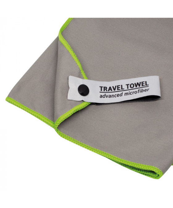 rychleschnoucí lehký šedý sportovní ručník 70g z velmi jemného mikrovlákna v kombinaci polyesteru a polyamidu absorbujícího až šestinásobek své hmotnosti a lze sbalit do kompaktního balíčku díky síťovanému pouzdru na zipVíce