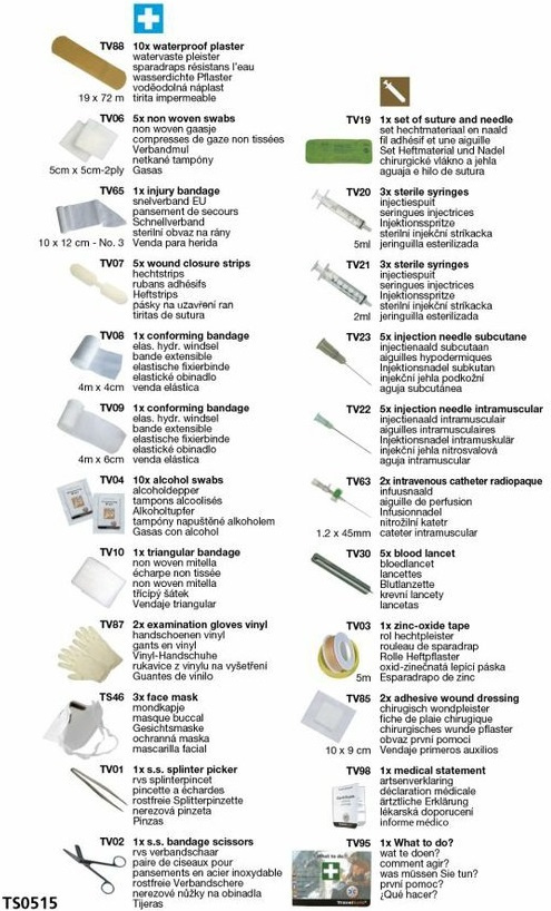 kombinovaná sterilní lékárna nezbytná při delším pobytu v zemích se zvýšeným rizikem hepatitidy B a HIV, cestování v primitivních podmínkách nebo při výpravách do džungle lékárna se skládá ze standardních potřeb pro poskytnutí první pomoci, jako jsou různé typy obvazů, náplastí, nůžky či krevní lancety vybavení je doplněné o další sterilní předměty, jako jsou injekční stříkačky a jehly nezbytné během dobrodružných cest v zemích se zvýšeným zdravotním rizikem uloženo v pouzdru na zip z odolného a pevného polyesteru s transparentními vnitřními kapsami díky průhlednosti kapes lze snadno a rychle identifikovat a použít uložený zdravotnický materiál zadní panel s poutkem pro možnost horizontálního nebo vertikálního upevnění k opasku či popruhu batohu souprava se sterilním materiálem obsahují lékařský certifikát pro použití a brožurku první pomoci v anglickém jazyce obsah: 10x voděodolná náplast (19 x 72 cm) 5x 2 netkané tampóny (5 x 5 cm) 1x sterilní obvaz na rány (10 x 12 cm) 5x náplast na uzavření ran 1x elastické obinadlo (4 cm x 4 m) 1x elastické obinadlo (6 cm x 4 m) 10x tampón napuštěný alkoholem 1x trojcípý šátek 2x sterilní chirurgické rukavice 3x obličejová ochranná maska 1x nerezová pinzeta 1x nerezové nůžky na obvazy 1x chirurgické vlákno a jehla 3x injekční stříkačka (5 ml) 3x injekční stříkačka (2 ml) 5x podkožní injekční jehla 5x nitrosvalová injekční jehla 2x nitrožilní katetr 5x krevní lanceta 1x oxid zinečnatá lepící páska (5 m) 2x adhezivní náplast na rány s přilnavým okrajem (10 x 9 cm) 1x certifikát 1x brožurka první pomoci v anglickém jazyce