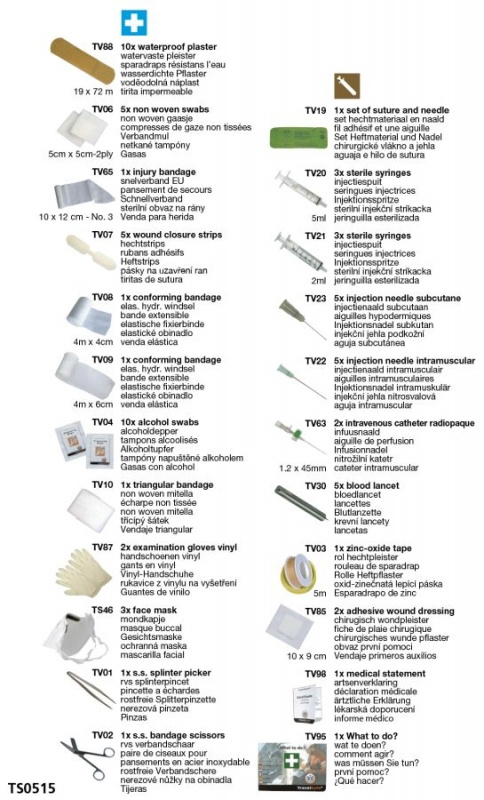 -souprava se sterilním materiálem obsahují lékařský certifikát pro použití a brožurku první pomoci v anglickém jazyce