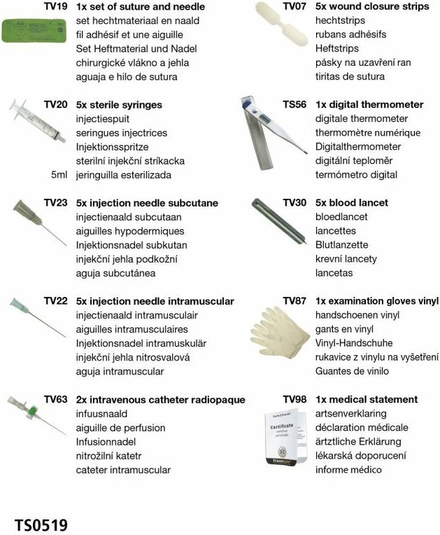 rozšířená sterilní lékárna jako doplněk pro základní sterilní lékárnu nezbytná při delším pobytu v zemích se zvýšeným rizikem hepatitidy B a HIV, cestování v primitivních podmínkách nebo při výpravách do džungle lékárna se skládá ze sterilní předmětů, jako jsou injekční stříkačky, jehly nebo krevní lancety nezbytné během cest v zemích se zvýšeným zdravotním rizikem uloženo v pouzdru na zip z odolného a pevného polyesteru s transparentními vnitřními kapsami díky průhlednosti kapes lze snadno a rychle identifikovat a použít uložený zdravotnický materiál zadní panel s poutkem pro možnost horizontálního nebo vertikálního upevnění k opasku či popruhu batohu souprava se sterilním materiálem obsahují lékařský certifikát pro použití a brožurku první pomoci v anglickém jazyce obsah: 1x chirurgické vlákno a jehla 5x injekční stříkačka (5 ml) 5x podkožní injekční jehla 5x nitrosvalová injekční jehla 2x nitrožilní katetr 5x náplast na uzavření ran 1x digitální teploměr 5x krevní lanceta 1x sterilní chirurgické rukavice 1x certifikát